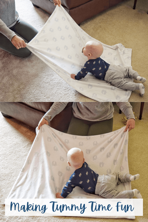 So how do we integrate vestibular activity into tummy time? Once your little one has gained enough neck strength to hold their head up for around 30 seconds at a time while laying on their bellies. it is a good time to try this exercise. Position your baby on their belly on one end of a long towel or blanket. Lift the end of the blanket or towel that baby is not laying on and slowly begin to pull baby forward. It’s like their very own magic carpet ride! Your baby may look concerned or confused at first, I know Eli did, but after a few seconds he broke out in a huge smile.