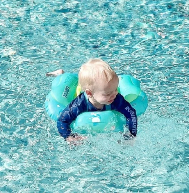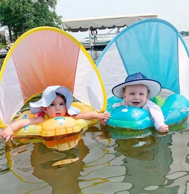 - LAYCOL Pool Floaties were the floaties that Katie and I purchased last year after loads of research, Katie and I purchased the and our boys loved them. The design of this float allows for babies to lay on their stomach or their back and the straps go over baby’s shoulders and clip between their legs so there is no room for them to slip out. The sun shade was a great added bonus for our boys' sensitive skin. Our boys loved their floats, E even used to take cat naps floating in his. The best part about this design is that it has lasted more than one season! How many baby items do you order that you only get to use for 2 or 3 months? The boys used them all last summer (cute little E+E pictured at 6 months) and R was able to use his this year on spring break (at 16 months!)