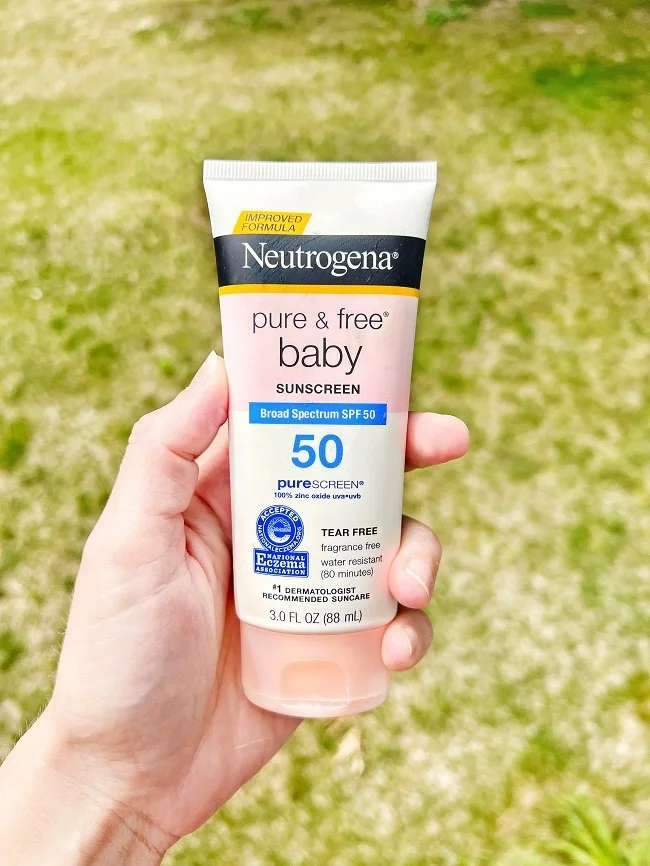 Neutrogena Baby Free and Clear is specially formulated and made with 100% zinc oxide. This sunscreen is a “tear-free formula” so it won't sting eyes and is free of fragrance, parabens, phthalates, dyes and irritating chemicals. R has eczema and this brand is hypoallergenic and is great for babies with sensitive skin. It has even been awarded the National Eczema Association Seal of Acceptance!