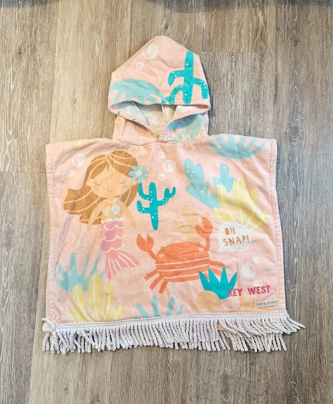 - Every parent knows how cute little ones look in hooded towels! But I have found when it’s time to dry off and leave the beach trying to keep a hooded/any regular towel on my son becomes a challenge. That was until my friend Kelsi showed up to a pool date with her daughter in an adorable poncho towel! Pull it on over their head and they stay warm and dry and you don’t have to worry about them dropping their towel or dragging it on the ground as you head home.