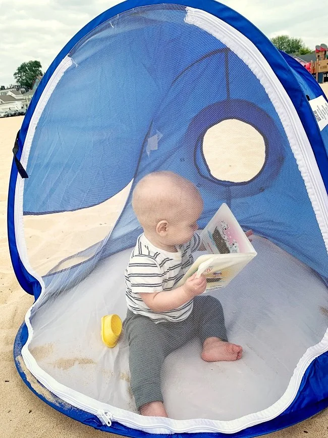 This pop-up tent (similar to the one R is using on the left in the picture above!) offers a mesh screen door to keep out excess sand and bugs as well as a mesh window to allow for a breeze while baby plays or naps.