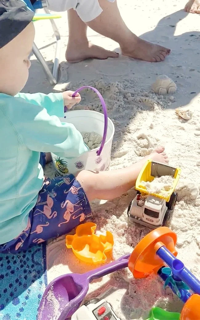 - A simple beach bucket like this can provide tons of fun for kids. They'll love filling it with sand, dumping it, filling it with water, dumping it, repeat, repeat! For more fun, get a whole lot of toys like this beach toy set that R has!